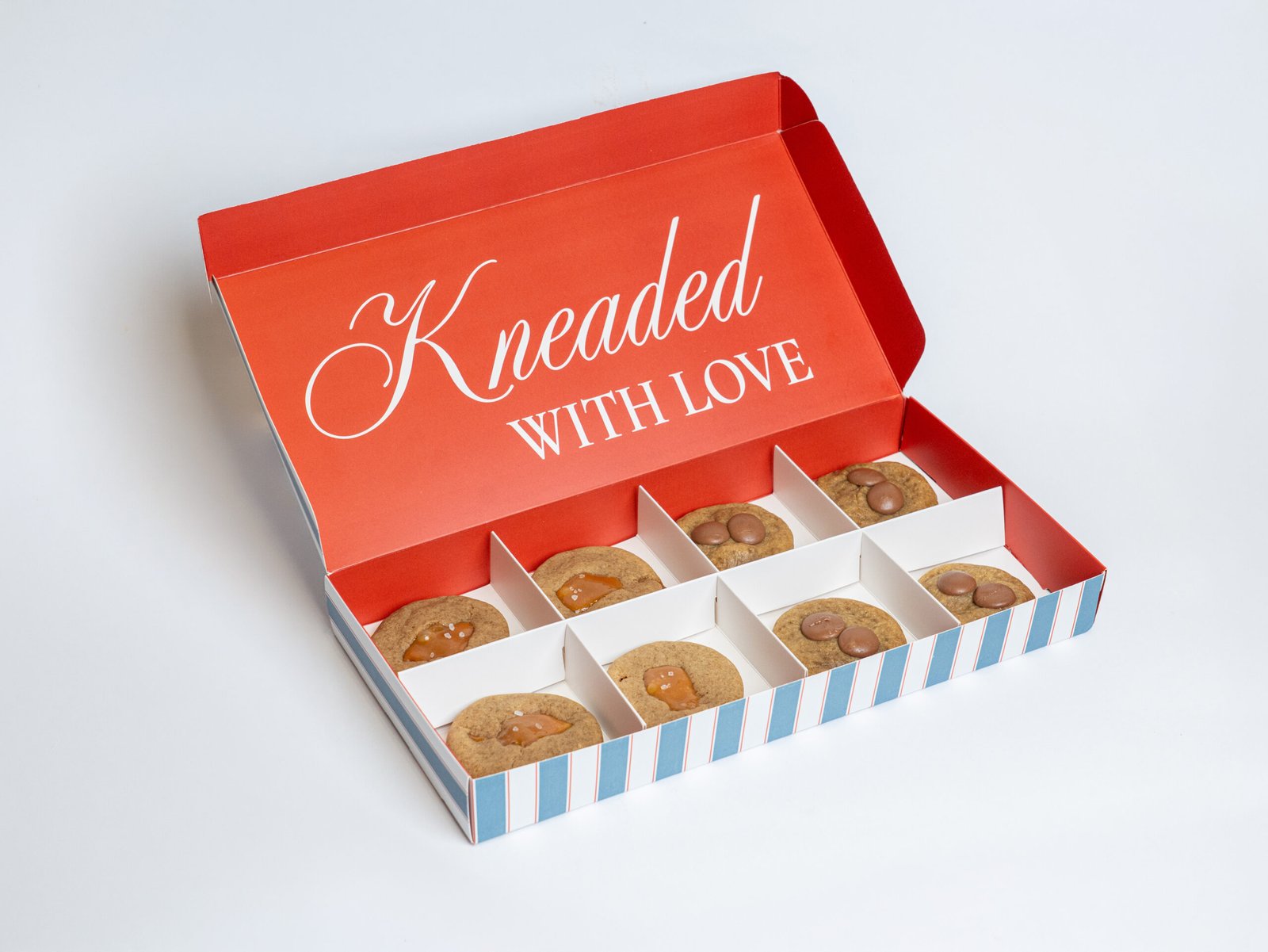 4 pieces Salted Caramel and 4 pieces Choco Chip cookies.